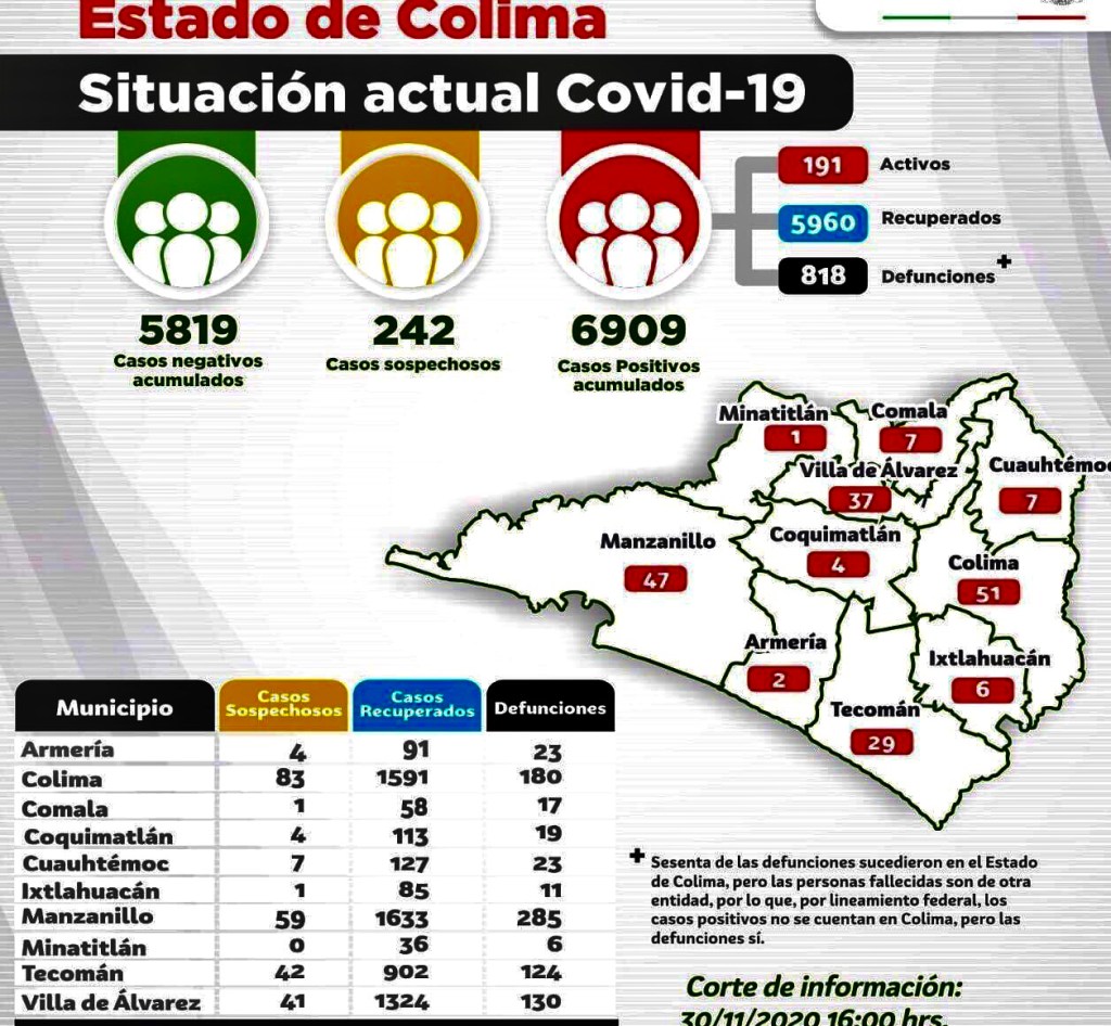 Hoy 30 de noviembre de 2020, se registraron 32 nuevos casos y 1 defunción por Covid-19, acumulando un total de 6 mil 909 casos confirmados y 818 decesos.