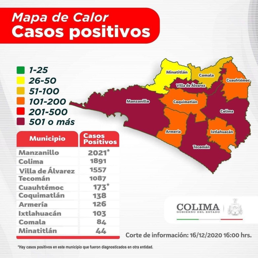 Además se informa que 3 mujeres fueron diagnosticadas como positivas al virus de SARS-CoV-2, entre los 35 y 45 años de edad; las 3 reciben atención ambulatoria. Por residencia, una es de Colima, una de Manzanillo y una de Villa de Álvarez.