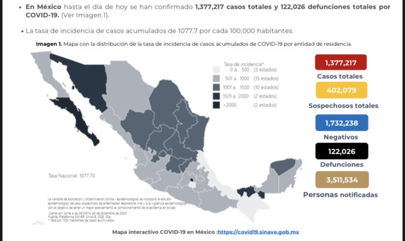 La Secretaría de Salud informó que en México hasta el día de hoy se confirmaronun millón 377 mil 217 casos totales y 122 mil 26 defunciones totales por COVID-19.