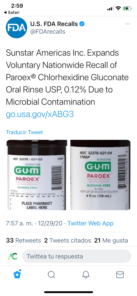 Luego de que la Administración de Alimentos y Medicamentos emitiera esta alerta, la empresa Sunstar Americas Inc. comenzó a retirar del mercado el enjuague bucal GUM Paroex.
