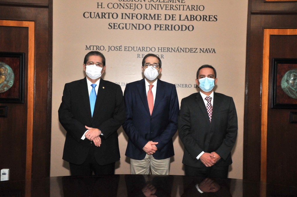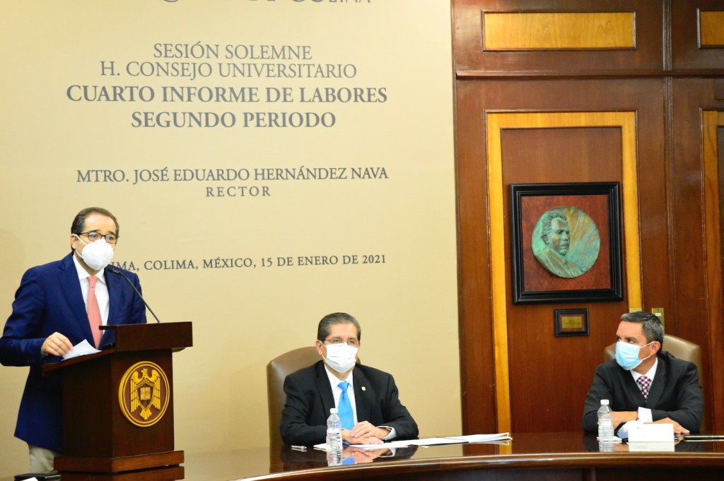 Con un resumen de los logros alcanzados durante los ocho años al frente de la Universidad de Colima, este viernes el rector José Eduardo Hernández Nava rindió su cuarto informe de labores del segundo período, en sesión solemne realizada ante el pleno del Consejo Universitario, máximo órgano de gobierno de la institución, en el que destacó como estrategia principal a la educación con responsabilidad social para fortalecer, dijo, “una institución viva, activa, abierta, interconectada y con los valores de unidad, libertad y respeto”.