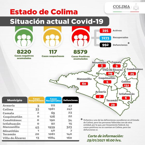 La Secretaría de Salud y Bienestar Social informa que las 12 defunciones ocurrieron en 7 hombres y 5 mujeres, entre los 60 y más de 65 años de edad, 11 estaban hospitalizados graves y uno intubado; eran originarios de Colima, Cuauhtémoc, Manzanillo y Villa de Álvarez; 2 de ellos foráneos que eran atendidos en Manzanillo y Villa de Álvarez.