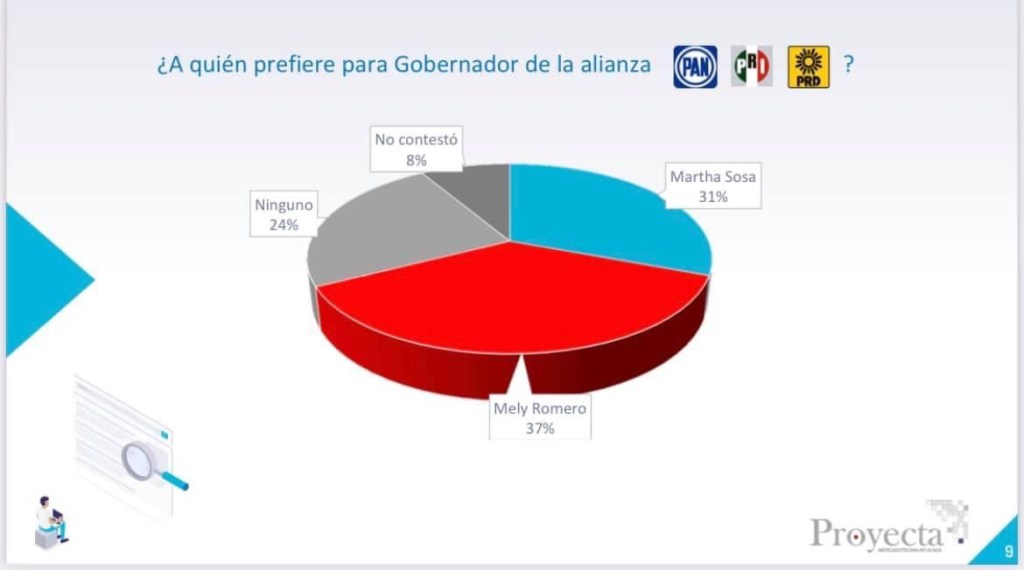 De acuerdo con la información que publica en su página de redes sociales de la Internet, la empresa demoscópica que dirige Angel Carrillo, Proyecta, asegura que la precandidata del tricolor aventaja ligeramente, por 6 puntos porcentuales, a la abanderada del blanquiazul.