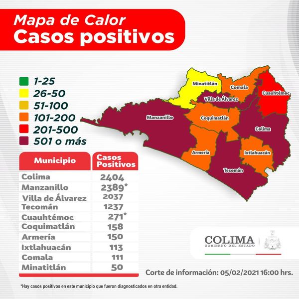Además, se informa que 32 mujeres fueron diagnosticadas como positivas al virus de SARS-CoV-2, entre los 5 y más de 65 años de edad; 30 reciben atención ambulatoria y 2 están hospitalizadas graves. Por residencia, 13 son de Villa de Álvarez, 8 de Colima, 6 de Manzanillo, 2 de Comala, 2 de Tecomán y una de Armería.