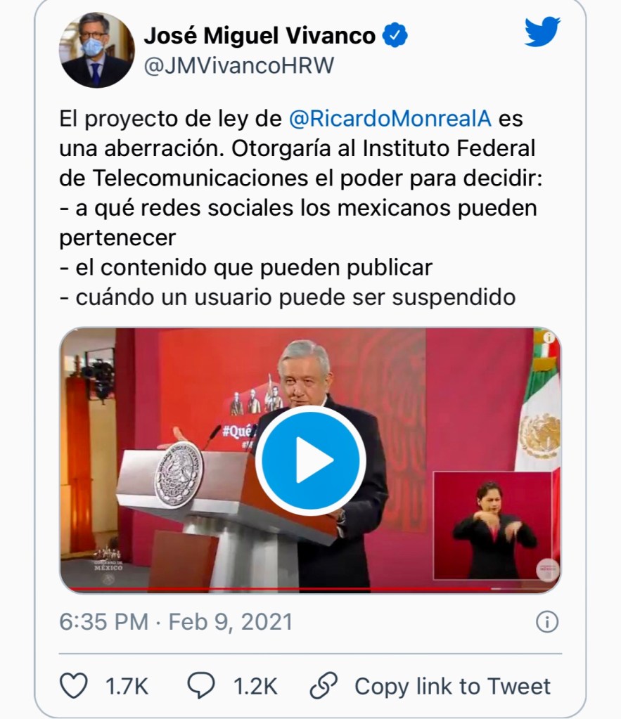 La iniciativa del senador Ricardo Monreal para regular las redes sociales es “una aberración”, según José Manuel Vivanco, director ejecutivo de la división de las Américas de la organización Human Rights Watch.