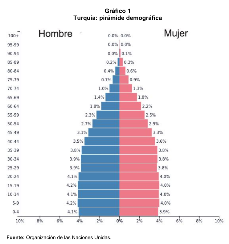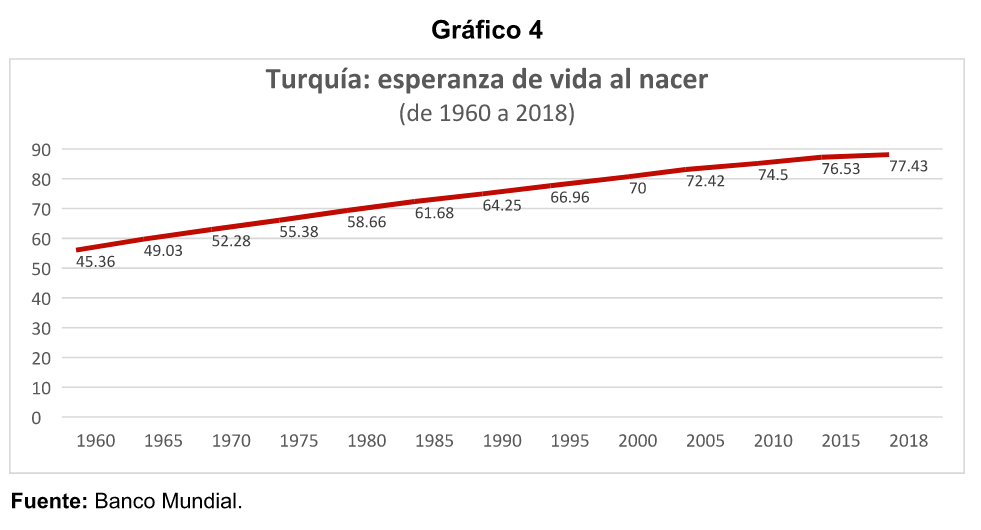 La pirámide demográfica de Turquía muestra un base que se mantiene más o menos estable entre los rangos de edades de 0 a los 39 años, momento en que empieza a estrecharse. La sociedad turca tiende al envejecimiento. Como se puede observar en le gráfico 4, la esperanza de vida ha aumentado en más de 30 años en el período 1960-2018, al pasar de 45. 36 a 77. 43. Los hombres tienen una esperanza de vida promedio de 75. 3 y las mueres de 80. 8 años, por lo que la diferencia entre ellos y ellas es de más de cinco años.
