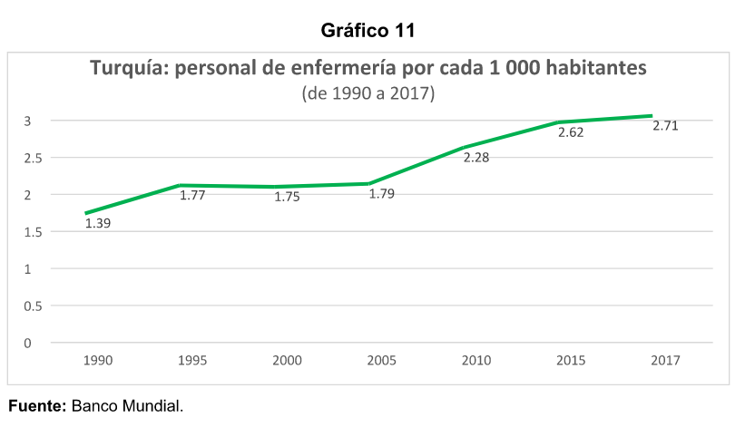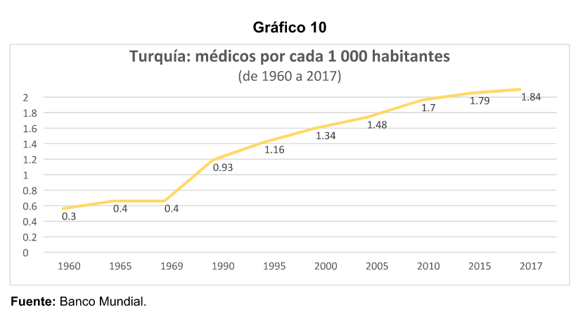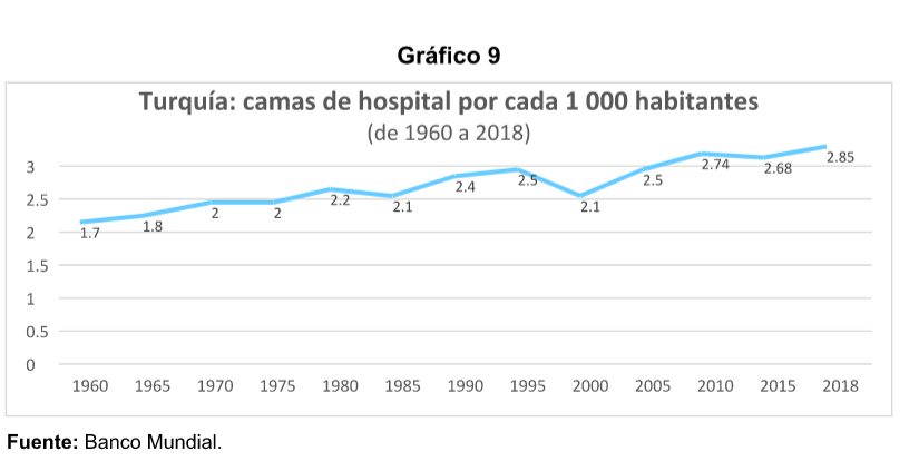 La capacidad hospitalaria ha crecido poco en las pasadas cinco décadas. Por ejemplo, en 1960, Turquía contaba con 1. 7 camas de hospital por cada 1 000 habitantes mientras que en 2018 la cifra había crecido a 2. 85, lo que parece insuficiente considerando el incremento demográfico. La proporción de médicos es igualmente baja. En 1960 era de 0. 3 y para 2018 alcanzaba los 1. 83 por cada 1 000 habitantes. Respecto al personal de enfermería, la cifra es de 1. 39 contra 2. 71 en el mismo período.