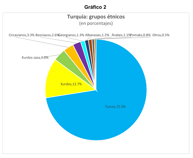 Turquía tiene una población de 87 954 997 habitantes y un territorio de 783 356 kilómetros cuadrados, por lo que su densidad demográfica es de 109 habitantes por kilómetro cuadrado. Los turcos constituyen el 72. 5 por ciento de la población, seguida por los kurdos, la minoría más importante y que representa un 12. 7 por ciento de los habitantes. Como es sabido, hay también kurdos en Irak, Irán, Azerbaiyán y Armenia y una parte importante de ellos se propone crear el Kurdistán, una suerte de hogar nacional, cuyo nacimiento implicaría restar espacios territoriales a los países citados. Otra minoría importante en Turquía la constituyen los kurdos zaza, que son distintos de los kurdos y hablan un idioma , el zazaki, más en sintonía con lenguas persas y kurdas. Detrás de ellos están los circasianos, que equivalen al 3. 3 por ciento de la población; los bosniacos, el 2. 6 por ciento; los georgianos, el 1. 3 por ciento; los albaneses, el 1. 2 por ciento; los árabes, el 1. 1 por ciento; los pomaks, el 0. 8 por ciento, y otros, el 0. 5 por ciento.[11]
