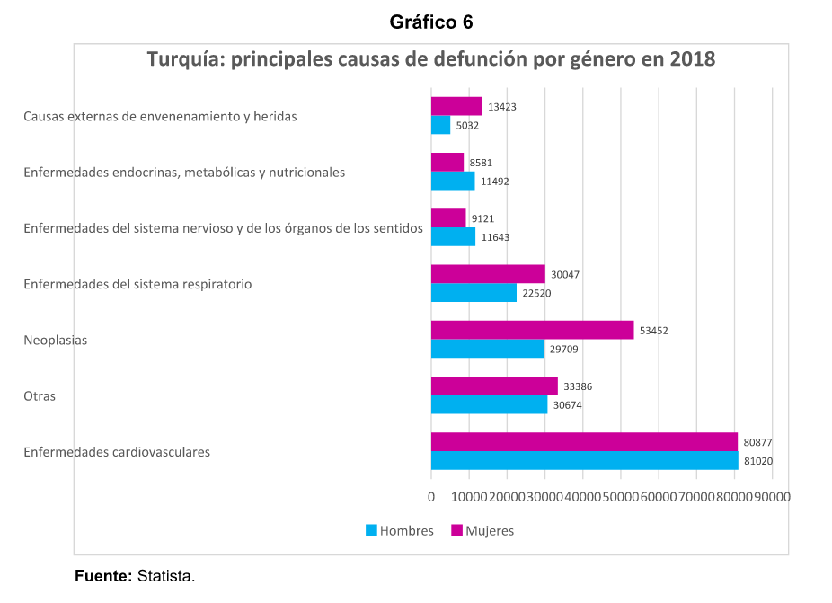 En Turquía, las principales causas de mortalidad incluyen en primer lugar, las enfermedades cardiovasculares seguidas de cánceres de distinto tipo. Las enfermedades del sistema respiratorio figuran en el tercer lugar, como se ilustra en el gráfico 6.