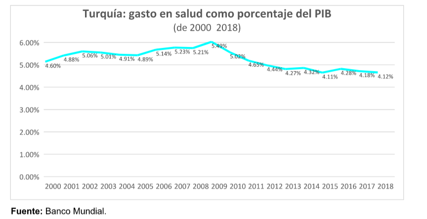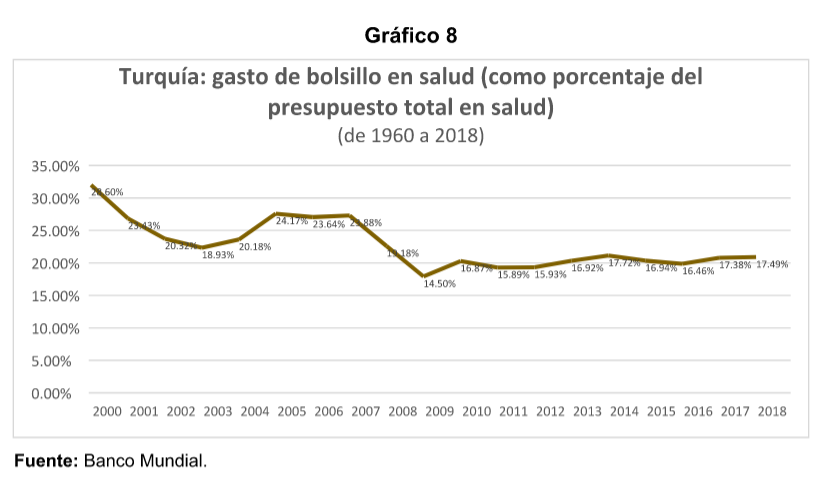 En Turquía el gasto en salud respecto al PIB ha oscilado entre el 4 y el 5 por ciento en lo que va del siglo, llegando a su pico en 2009, cuando alcanzó 5. 49 y su punto más bajo lo registró en 2018, con 4. 12 por ciento. El gasto en salud per cápita rondaba los 390 dólares e 2018, que contrastan con los 570. 85 que se gastaron en 2008. Donde se observa un cambio notable es en el gasto de bolsillo porque mientras que en el año 2000 era del 28. 6 por ciento del presupuesto total en salud, para el 2018 equivalía al 17. 49 por ciento.