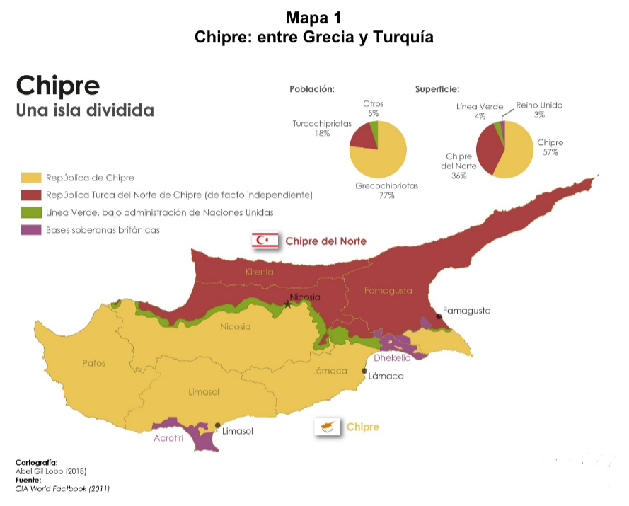 El país es un puente entre Medio Oriente y Occidente. Turquía mantiene una legendaria disputa con Grecia en torno a Chipre. Esta ínsula alberga una población chipriota-turca -18 por ciento- y chipriota-griega -77 por ciento-, situación que propició que en 1974 el ejército turco invadiera la parte norte de la ínsula para evitar que el país se uniera a Grecia tras un golpe de Estado gestado en Atenas. El Chipre griego ocupa el 57 por ciento de la isla en tanto el Chipre turco el 36 por ciento. Así, fue proclamada la República Turca del Norte de Chipre, la cual sólo cuenta con el reconocimiento internacional de Ankara. Naciones Unidas emplazó una operación de mantenimiento de la paz desde 1964 que ha permanecido en el territorio a manera de “muro de contención” y que evita que las tensiones entre “los dos Chipres” se desborden. Empero, poco se ha avanzado en términos de la reconciliación nacional, como se ilustra en el mapa 1.