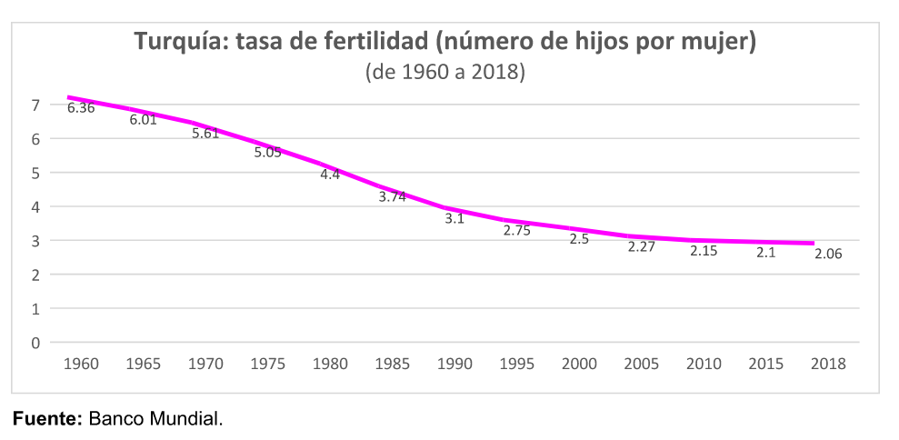 La tasa de fertilidad está cerca de la tasa de reemplazo, pero se ha observado un declive respecto a 1960, cuando la proporción era de 6. 36 hijos por mujer. Si bien desde 2008 el gobierno de Erdogan a conminado a las familias a tener tres hijos y, e ser posible, cuatro o cinco, lo cierto es que la tasa de natalidad ha caído constantemente a lo largo de ese período.[16]