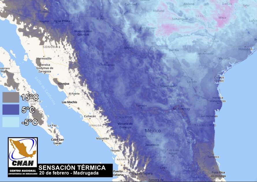 Comienza un gradual aumento en la temperatura mínima en el norte y noreste de México. Sin embargo, la masa de aire polar-ártica comienza a desplazarse esta noche sobre el oriente del país, favoreciendo temperaturas frías.