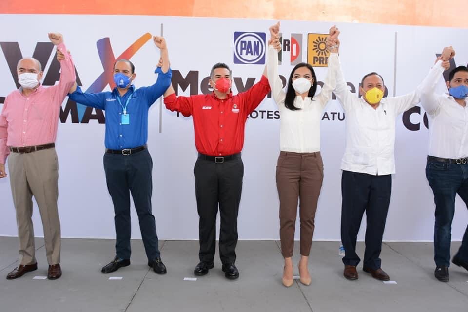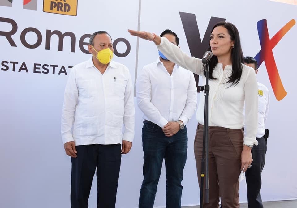 Al término de este mensaje, el dirigente nacional del PRI, Alejandro Moreno tomó protesta a Mely Romero, con el respaldo de las dirigencias nacionales del PAN y PRD, y sus homólogos en las dirigencias estatales.
