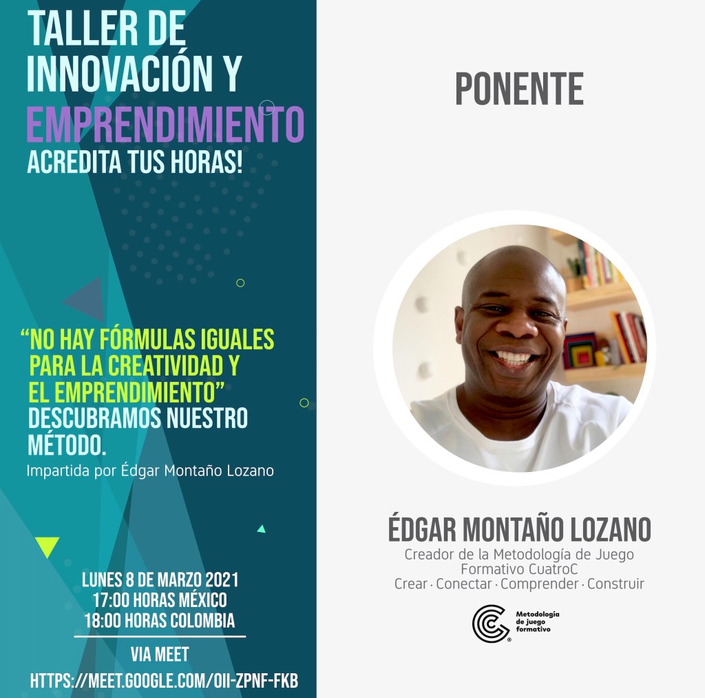 Durante esta semana, del lunes 8 al viernes 12, la Universidad de Colima, a través de su Dirección General de Innovación y Cultura Emprendedora, invita a las y los alumnos de esta casa de estudios a participar en el “Taller de innovación y emprendimiento”, y al webinar del mismo nombre que impartirá el maestro colombiano Édgar Montaño Lozano, creador de la metodología de Juego Formativo Cuatro C (Crear, Conectar, Comprender y Construir).