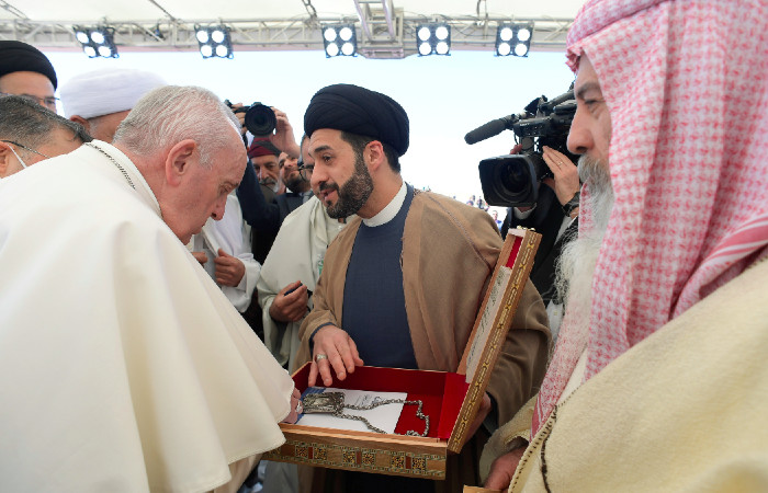 Horas antes en Nayaf, Francisco se reunió con el gran ayatolá Ali al-Sistani, una visita que fue una poderosa señal de convivencia en un país desgarrado por la violencia.