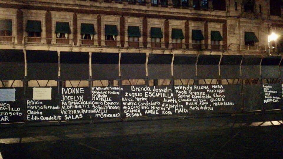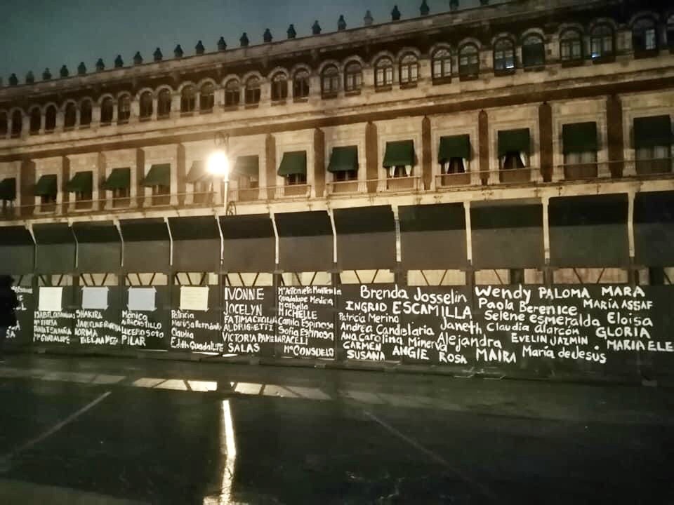 Mujeres graban en las vallas de Palacio Nacional los nombres de víctimas de feminicidio