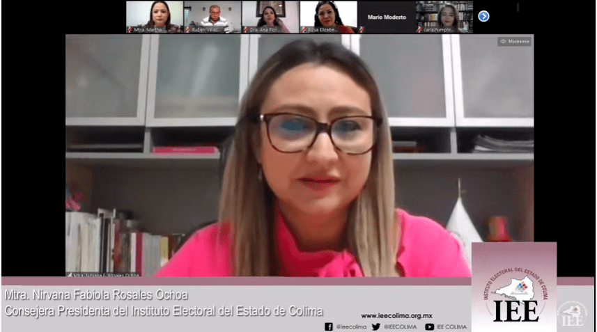 En su mensaje de bienvenida, la Consejera Presidenta del Instituto Electoral del Estado de Colima (IEE), Nirvana Fabiola Rosales Ochoa, recordó que este 2021 representa para México la elección más grande, pues por primera ocasión las 32 entidades federativas coincidirán en un proceso electoral, el cual, entre sus múltiples retos, destaca la participación política de las mujeres, libre de violencia.