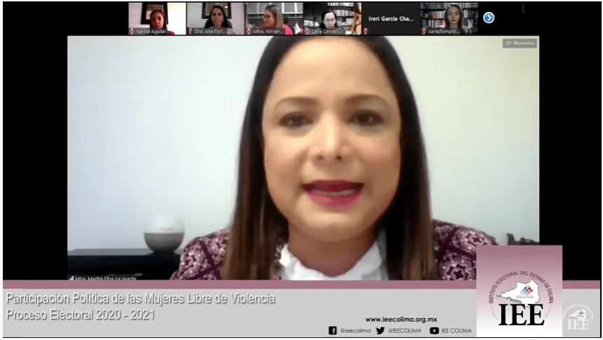Por su parte, la Consejera Martha Elba Iza Huerta, Presidenta de la Comisión de Equidad, Paridad y Perspectiva de Género del IEE Colima, señaló en la relatoría del evento que como conclusiones del mismo pudo destacarse la necesidad de promover la cultura de la denuncia y dar a conocer a las mujeres que deben ejercer sus derechos político electorales, tanto para contender para un cargo de elección popular, como para el ejercicio del mismo; libres de todo tipo de violencia, en particular de la violencia política en razón de género; finalizando con la entrega del reconocimiento virtual a la Consejera Carla Astrid Humphrey Jordán, por su excelente participación en el evento.