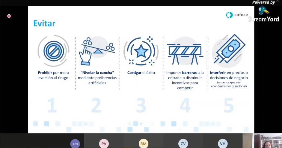 Explicó que la COFECE tampoco regula precios ni recomienda que se regulen, ya que éstos, dijo, se deben regular por la ley de la oferta y la demanda, pues si se crean autoridades o reguladores -a cualquier nivel- que intenten poner un precio, se ocasionan distorsiones en los mercados: “La COFECE procura otorgar claridad y certidumbre, brindar flexibilidad sobre los medios (a personas y productores) y asegurar que las empresas tengan ductilidad al cambio y puedan adaptarse, buscando el medio menos intrusivo para ese fin y que todas las políticas públicas tengan un objetivo público legítimo”.