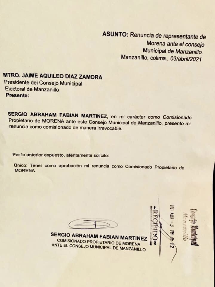 Este sábado el comisionado propietario de MORENA ante el consejo municipal del IEE en Manzanillo, Sergio Abraham Fabián Martínez presentó su renuncia en carácter de irrevocable ante esta instancia por irregularidades en los candidatos que conforman la planilla municipal encabezada por Griselda Martínez Martínez.