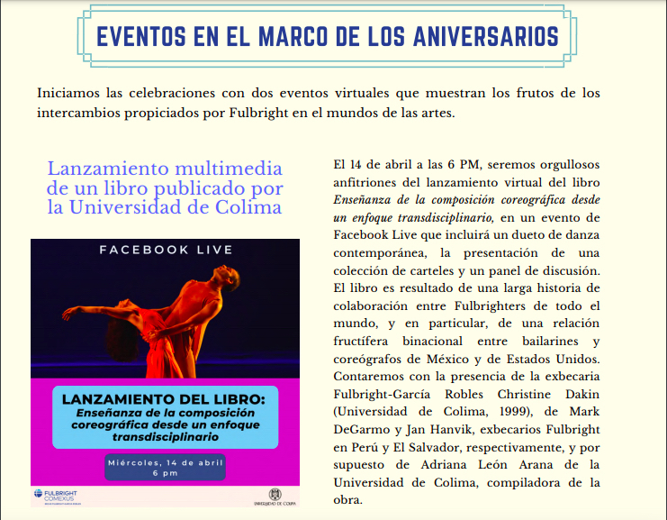El próximo miércoles 14 de este mes, en el marco de festejos por el 30 aniversario de COMEXUS y las becas Fulbright-García Robles, se realizará la presentación virtual del libro “Enseñanza de la composición coreográfica desde un enfoque transdisciplinario”, compilado por Adriana León Arana y editado por la Universidad de Colima, a partir de las seis de la tarde.