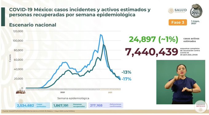 La Secretaría de Salud estima que en México hay 2 millones 534 mil 682 casos de Covid-19. Este indicador se calcula con los contagios confirmados, con el porcentaje de positividad y la asociación epidemiológica.