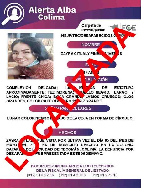 Sin embargo aún siguen desaparecidas: Rosa Agripina Hernández Bernabé de 15 años de edad, quién fue vista por última vez el día 3 de mayo cuando salió de su casa en Zacualpán, Villa de Álvarez y Betsaida Morales Palacios de 13 años de edad, quién saliera de su hogar, el día 4 de mayo domicilio ubicado en Barrio 1 Valle de Las Garzas Manzanillo.