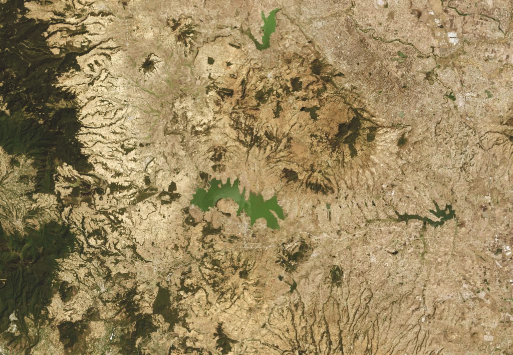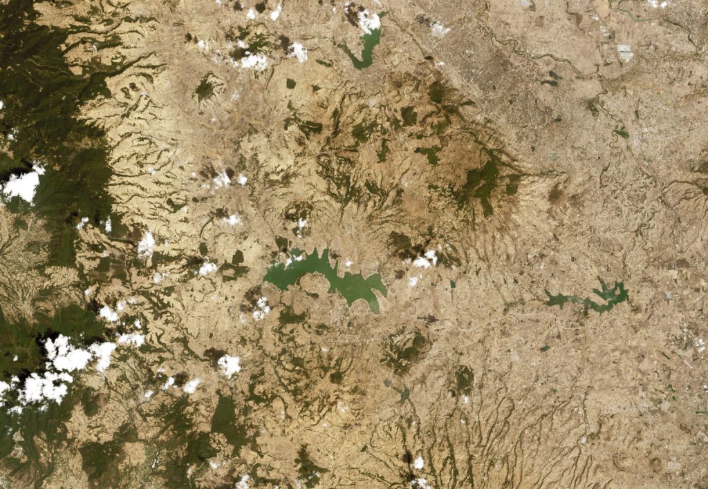 De acuerdo con dos imágenes obtenidas por el Generador operacional de imágenes de tierra (OLI, por sus siglas en inglés) en Landsat 8, la presa Villa Victoria, uno de los principales suministros de agua a la Ciudad de México, ha disminuido sus niveles de agua durante el último año.