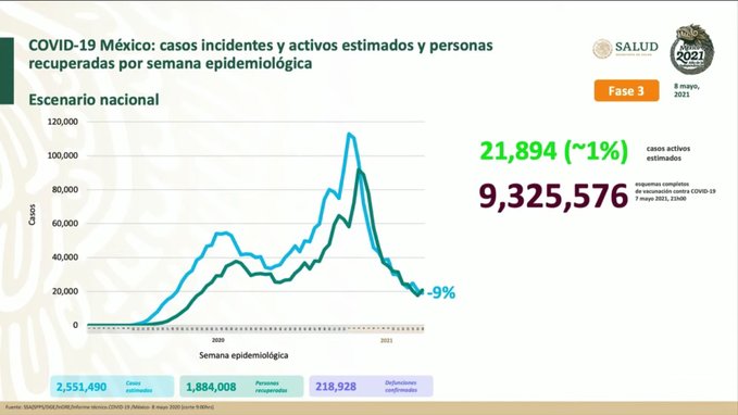 La Secretaría de Salud informó que en México se registran 2 millones 364 mil 617 casos positivos acumulados y 218 mil 928 muertes por COVID-19