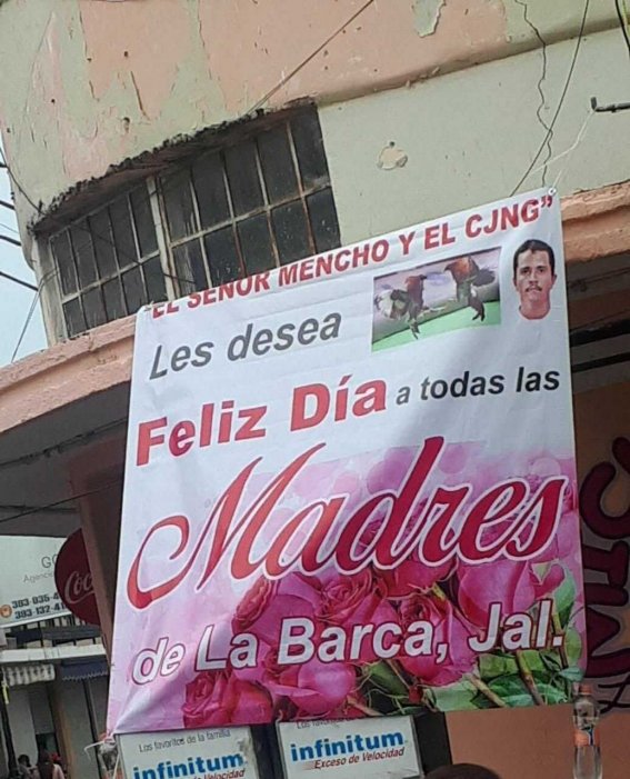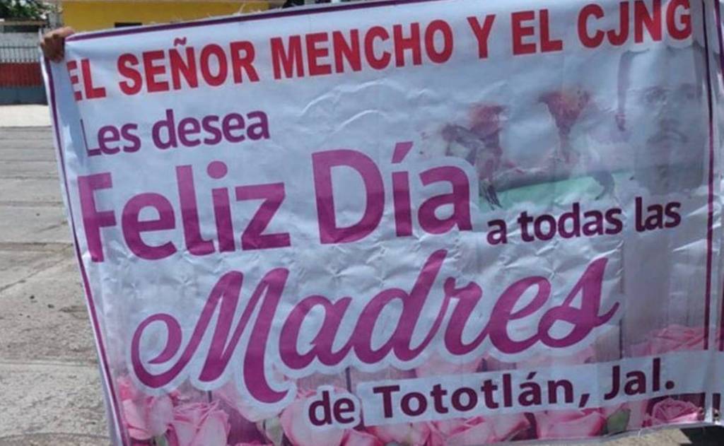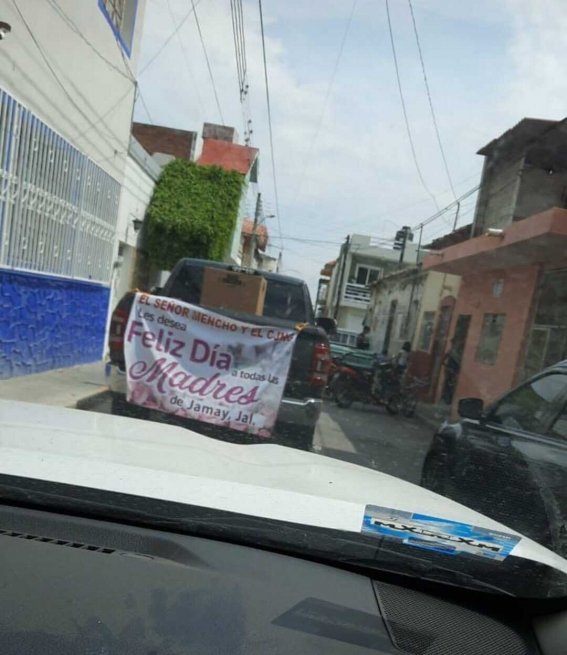 “El señor Mencho y el CJNG les desea feliz día a todas las madres”, dice una manta colocada en el lugar en donde repartieron los electrodomésticos en Jalisco.