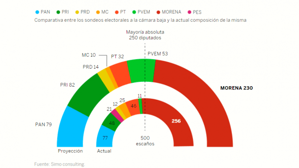 De acuerdo con una encuesta divulgada este 17 de mayo por el diario El País, el partido del presidente Andrés Manuel López Obrador, Morena, dejará de ser mayoría absoluta en la Cámara de Diputados, puesto que de acuerdo a las tendencias actuales, obtendría 230 curules, frente a las 256 con que cuenta actualmente.