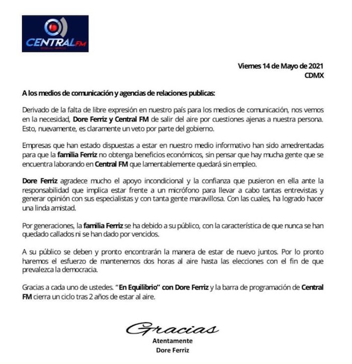 En un comunicado firmado por Dore Ferriz, esposa de Pedro Ferriz de Con, señaló que empresas que han estado dispuestas a anunciarse con ellos “han sido amedrentadas para que la familia Ferriz no obtenga beneficios económicos, sin pensar que hay mucha gente que se encuentra laborando en Central FM“.