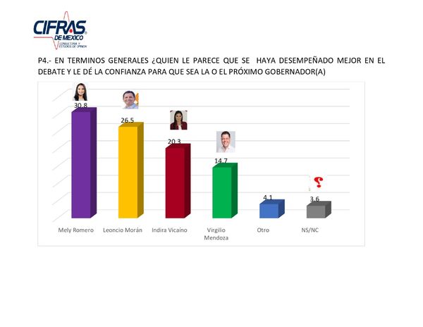 En la pregunta cuatro respecto a quien le pareció que haya tenido el mejor desempeño en el debate y que le de confianza para que sea la o el próximo gobernador(a), el 30.8% dijo que Mely Romero; le siguió Leoncio Morán con un 26.5%; Indira Vizcaíno quedó con 20.3; Virgilio Mendoza con 14.7; 4.1 dijo que otro y 3.6 no supo o no contestó.