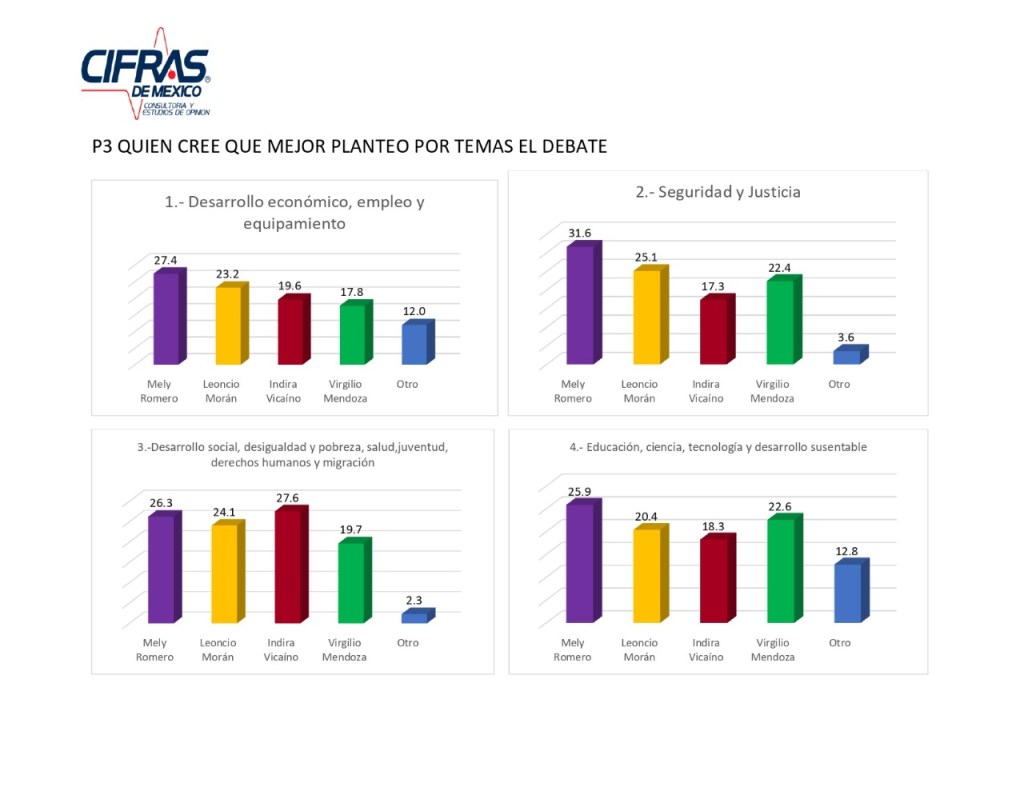Ante la pregunta acerca de quién cree que mejor planteó por temas el debate, en el tema Desarrollo económico, empleo y equipamiento, el 27.4% coincidió en que la mejor fue Mely Romero; seguida por Leoncio Morán con un 23.2%; Indira Vizcaíno el 19.6%; Virgilio Mendoza 17.8% y un 12.0 para otro candidato(a).En el tema de Seguridad y Justicia, el 31.6% consideró que Mely Romero fue la mejor; 25.1% señaló a Leoncio Morán; 17.3% dijo que Indira Vizcaíno; y 22.4% dijo que Virgilio Mendoza, mientras que un 3.6% dijo que otro.