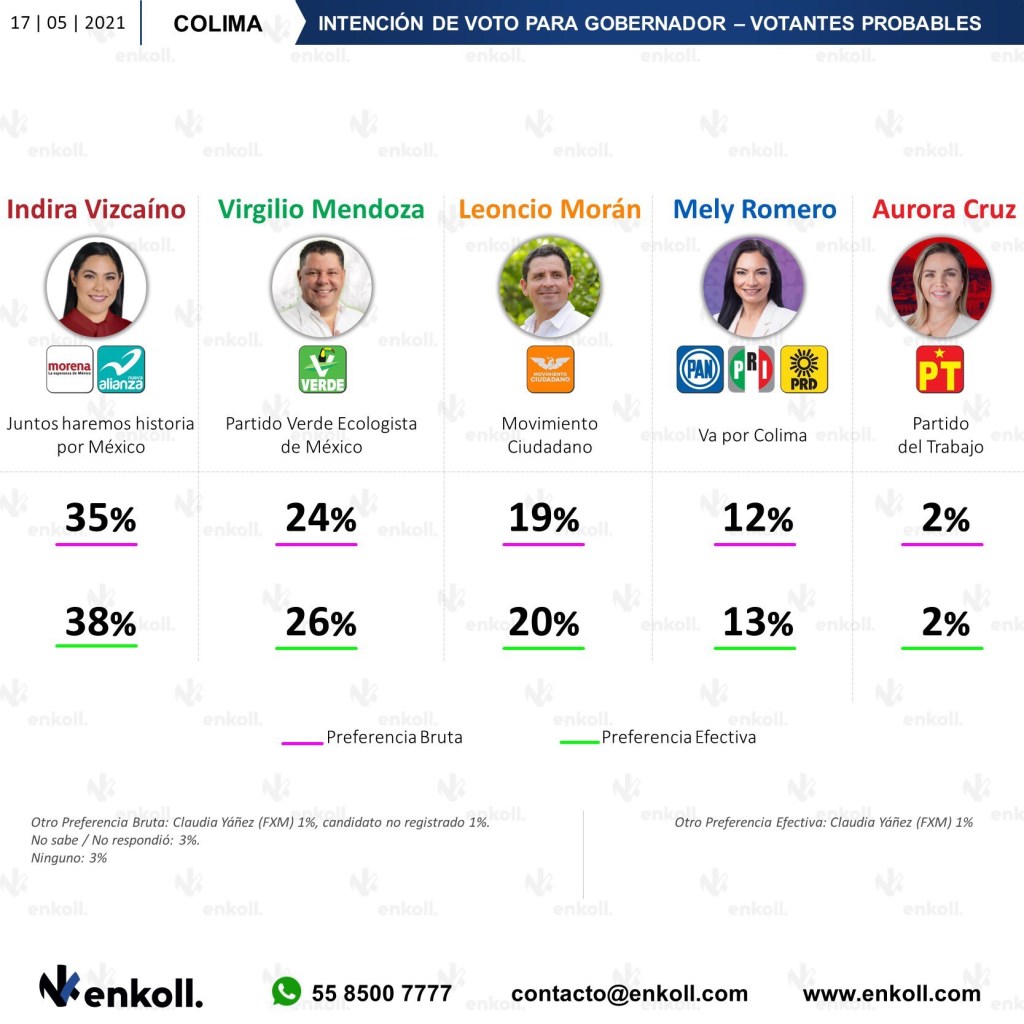 📊#EnkollDice En su más reciente estudio “Rumbo a la Gubernatura de #Colima”, @PartidoMorenaMx y su candidata a la gubernatura, @indira_vizcaino, registran ventajas. 12% sobre su más cercano rival 35% y 38%, en preferencia bruta y efectiva. #6Junio