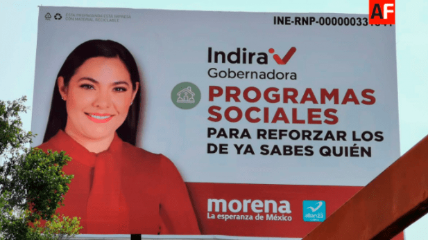 La aspirante a gobernar Colima, Indira Vizcaíno, usa tres elementos indebidos en al menos uno de sus espectaculares: menciona a “ya sabes quién”, menciona que los programas sociales son de él (es decir, de López Obrador) y asegura que votar por ella reforzará dichos programas, con lo que se hace uso electoral de los mismos.