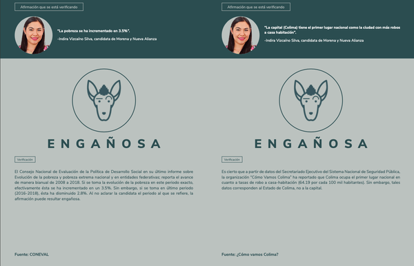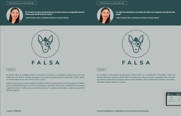 Una de las afirmaciones verificada y calificada como falsa fue de Indira Vizcaíno Silva, candidata de Morena y Nueva Alianza quien dijo: “En 10 años el numero de personas que no tienen acceso a la seguridad social en Colima pasó del 48 al 51 por ciento”.