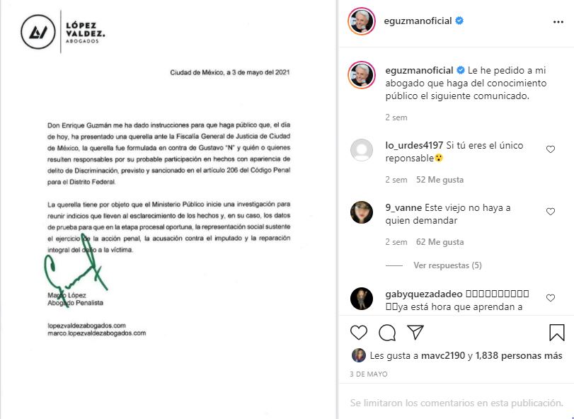 El interprete de “La plaga” interpuso dos querellas, la primera el 20 de abril ante la Fiscalía de Investigación de Delito de Violencia Familiar en contra de Frida Sofía, y la segunda la presentó el 3 de mayo ante la Fiscalía General de Justicia de la Ciudad de México en contra del periodista Gustavo Adolfo Infante por discriminación e incitar al odio hacia su persona.