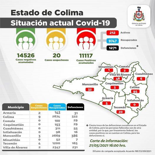 La Secretaría de Salud del Gobierno del estado dio a conocer este viernes 21 de mayo, el avance de la pandemia de coronavirus Covid-19 en la entidad: 11,117 casos positivos acumulados, 212 casos activos, 20 casos sospechosos, 9,747 personas recuperadas y 1,271 personas fallecidas