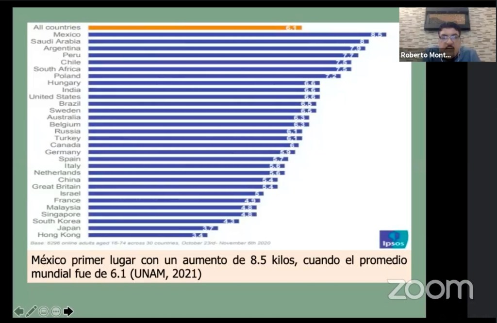 Entre otros datos interesantes, dijo que durante la pandemia, en México se incrementó en 8.5 kilos el peso corporal, cuando el promedio mundial fue de 6.1 kilogramos y que nuestro país es el principal consumidor de refrescos en el mundo, lo que mata al año a 24 mil personas por ingesta calórica.