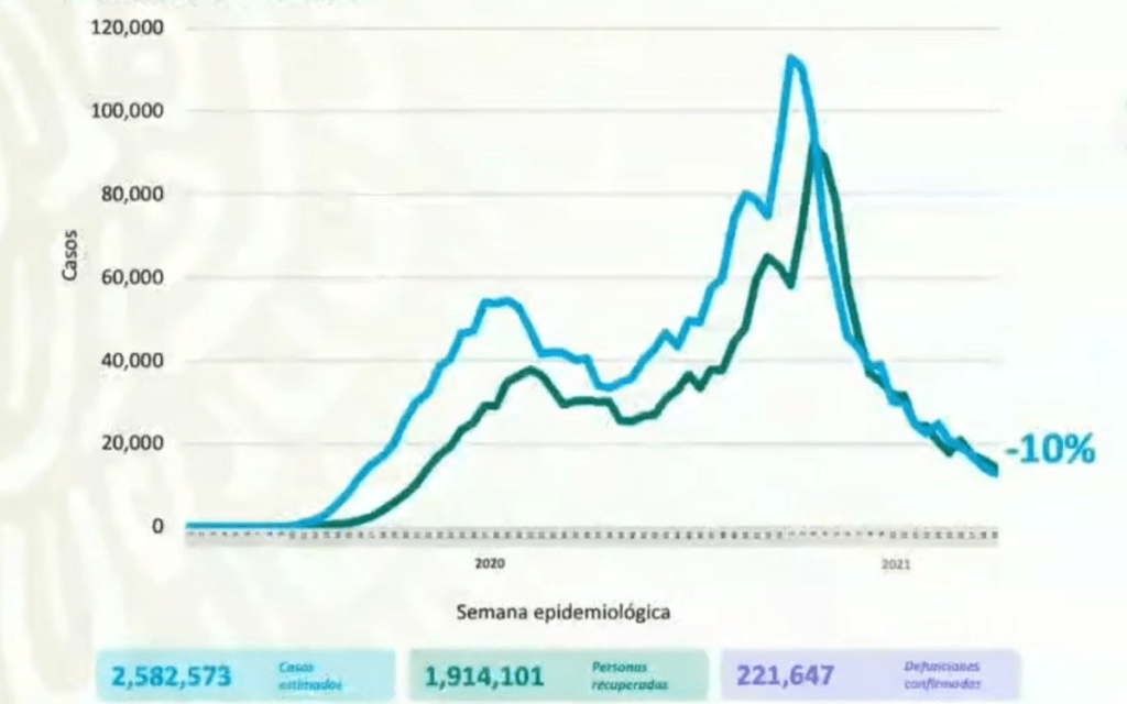 La Secretaría de Salud informó que en México se alcanzaron las 221 mil 647 muertes por COVID-19. Suman 18 mil 74 casos activos estimados
