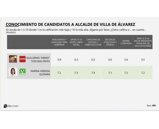 De acuerdo a los resultados arrojados de dicho análisis, son dos los candidatos que se mantienen con mayor posibilidades de asumir la presidencia municipal en Villa de Álvarez en los próximos comicios, Karina Heredia y Guillermo ‘Memo’ Toscano, siendo la primera la mejor calificada a tan solo 13 días de la elección.