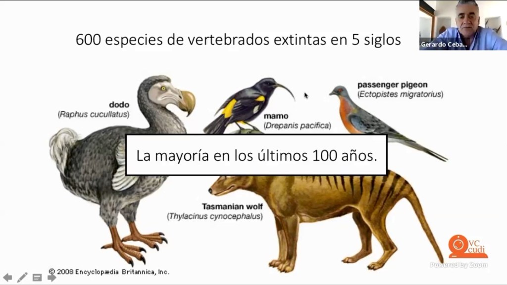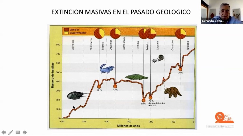 “Las nuevas estimaciones indican que las especies que se perdieron en 100 años debieron haberse perdido en 50 mil”, dijo Gerardo Ceballos González, investigador del Instituto de Ecología de la UNAM durante su charla virtual “La sexta extinción de especies y el futuro de la humanidad”, que dictó ante estudiantes y docentes de la Facultad de Ciencias Biológicas y Agropecuarias (FCBA), en Tecomán.