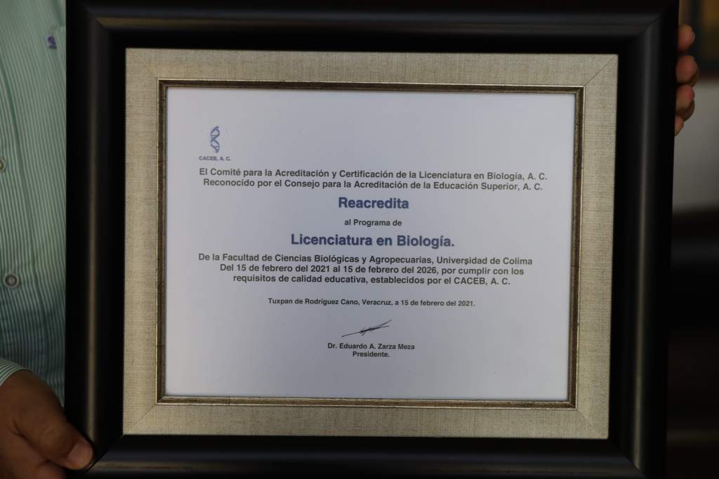 En ceremonia presencial realizada este miércoles en la sala de juntas de rectoría, el Comité para la Acreditación y Certificación de la Licenciatura en Biología, AC (CACEB), entregó una recertificación por cinco años al programa educativo en Biología de la Facultad de Ciencias Biológicas y Agropecuarias (FCBA), “por cumplir con los requisitos de calidad educativa establecidos por el CACEB”, organismo reconocido por el Consejo para la Acreditación de la Educación Superior, AC.