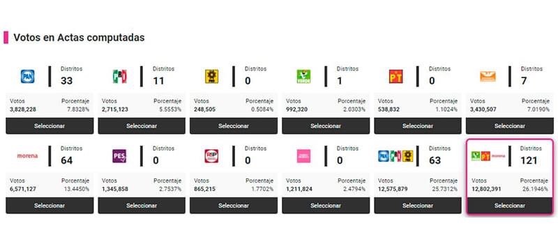 Por su parte, Movimiento Naranja (MC) ganó en siete distritos, con tres millones 430 mil 507 votos.