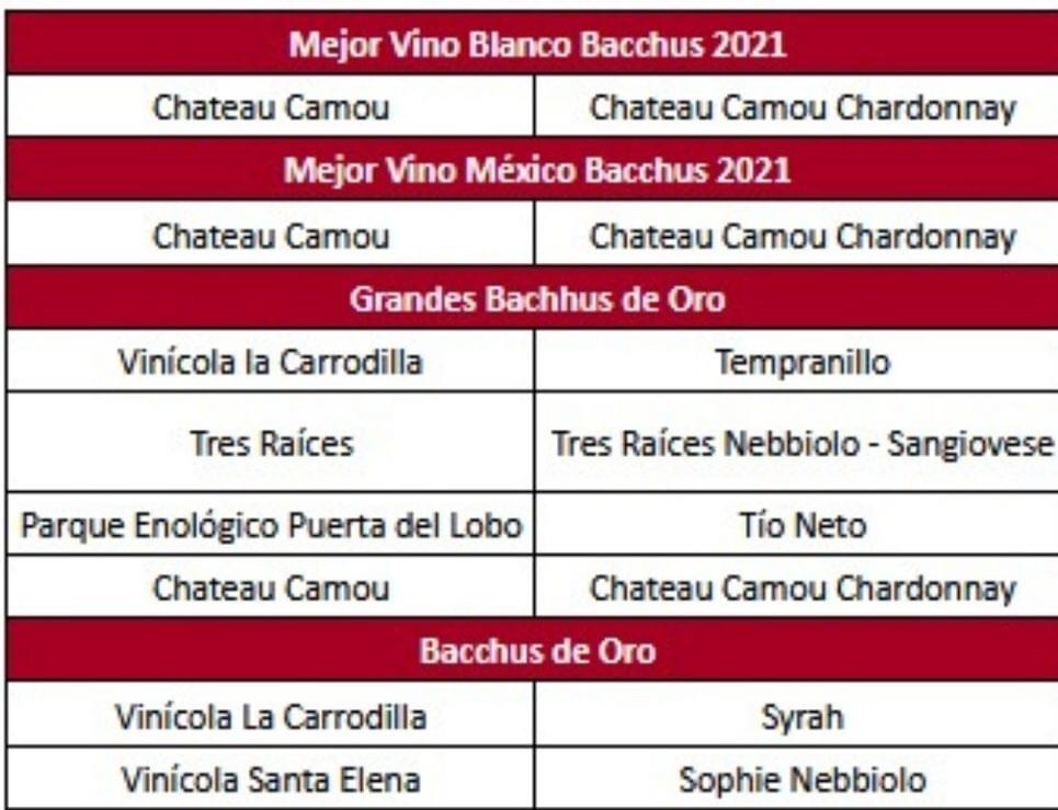 Cabe mencionar que, adicionalmente, en la categoría Grandes Bacchus de Oro se distinguió a vinícolas como La Carrodilla, Tres Raíces y el Parque Enológico Puerta del Lobo. En la Bacchus de Oro también estuvieron presentes la Vinícola Santa Elena, Pozo de Luna, San Lorenzo, Pedro Domecq y Monte Xanic.