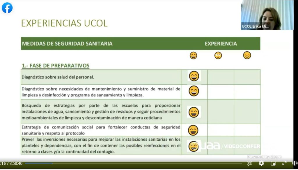 Durante su participación, precisó que “no tuvimos que invertir en infraestructura, pues las instalaciones, en su mayoría, cumplen con las medidas sanitarias de espacio y ventilación”. Agregó que tuvieron experiencias satisfactorias, aunque también hubo algunas dificultades al aplicar los lineamientos rectores, “por lo que los resultados generales estuvieron ligeramente alejados de lo esperado”.