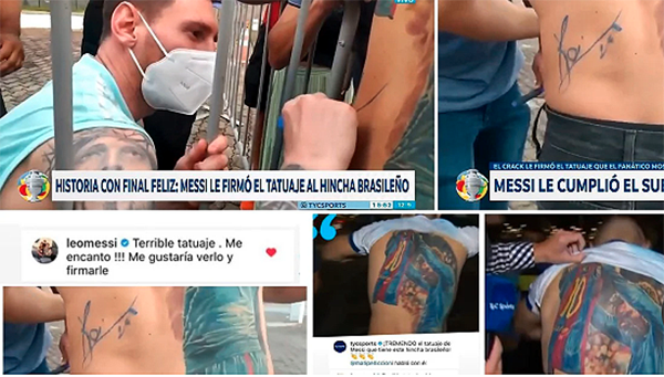 Se sabe que este hincha brasileño, ferviente admirador del argentino, estuvo en el hotel en Brasilia en donde se hospeda la albiceleste que está disputando la Copa América, y ahí ante algunos medios mostró la imagen que lleva en la piel, con lo que consiguió que Messi viera el video y prometió que lo firmaría.