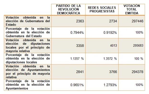 En la siguiente tabla se muestran los resultados electorales y porcentajes de votación en cada elección de los referidos partidos políticos: